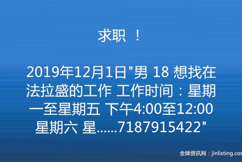 !!!求职 !!! “男 18 想找在法拉盛的工作 工作时间:星期一至星期五 下午4:00至12:00 星期六 星期天(早晚班都可以) 会做 甜品, 奶茶 和餐馆服务 会说 中,英,粤语 肯学 做事认真 电话号码:7187915422”