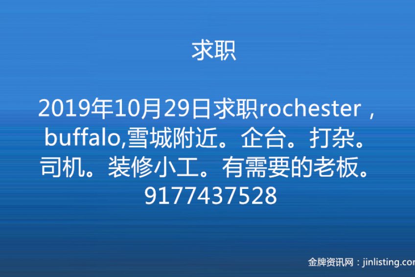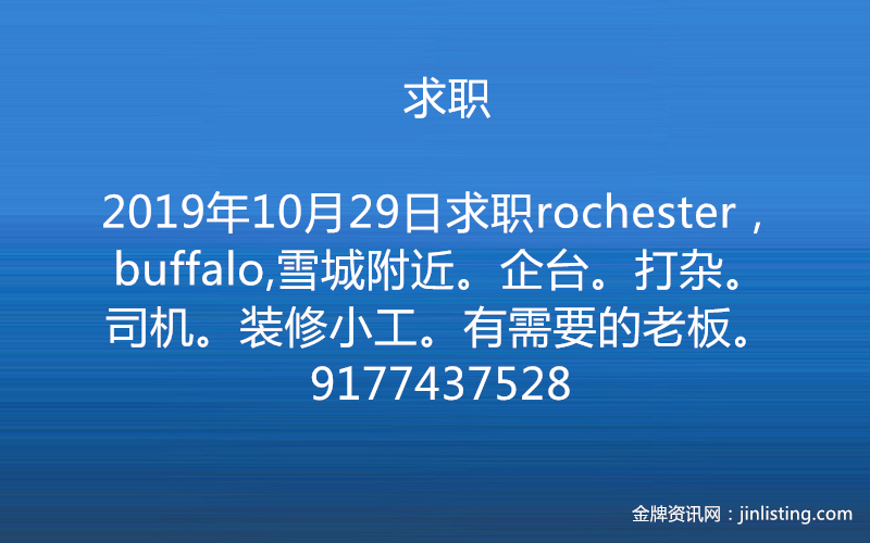 求职rochester,buffalo, 雪城附近。企台。打杂。司机。 装修小工。 有需要的老板。。9177437528