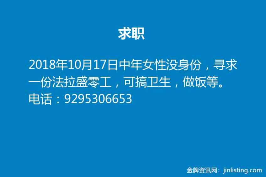 中年女性没身份,寻求一份法拉盛零工,可搞卫生,做饭等。电话:9295306653