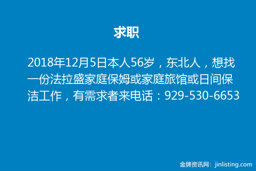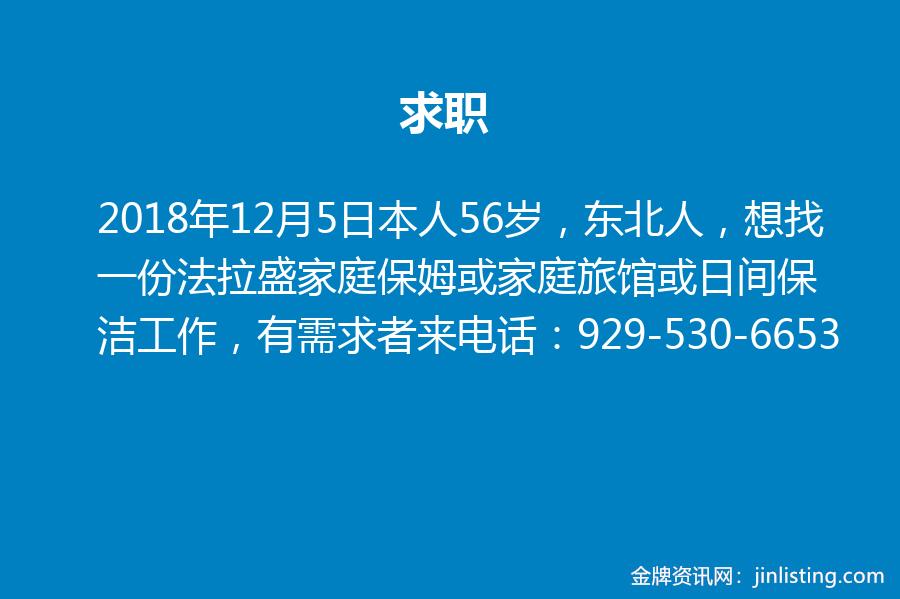 本人56岁,东北人,想找一份法拉盛家庭保姆或家庭旅馆或日间保洁工作,有需求者来电话:929-530-6653