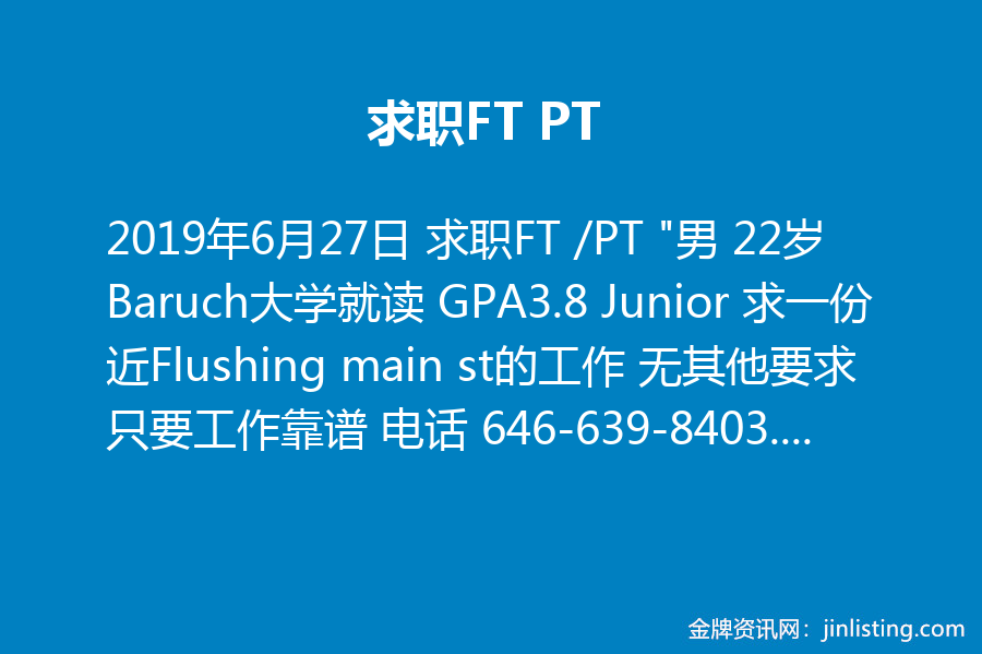 求职FT /PT “男 22岁 Baruch大学就读 GPA3.8 Junior 求一份近Flushing main st的工作 无其他要求 只要工作靠谱 电话 646-639-8403 可短信可直接电话”