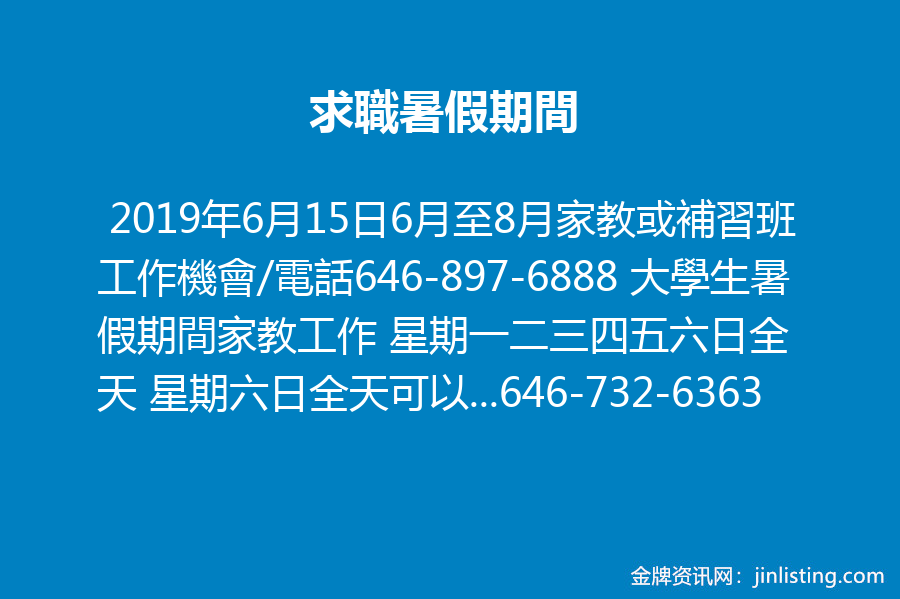 求職暑假期間6月至8月家教或補習班工作機會/電話646-897-6888 大學生暑假期間家教工作 星期一二三四五六日全天 星期六日全天可以工作時間 法拉盛附近,現金工作機會 數學英文或其他課程均輔導 陪伴小孩做功課及課外活動 電話號碼/646-732-6363