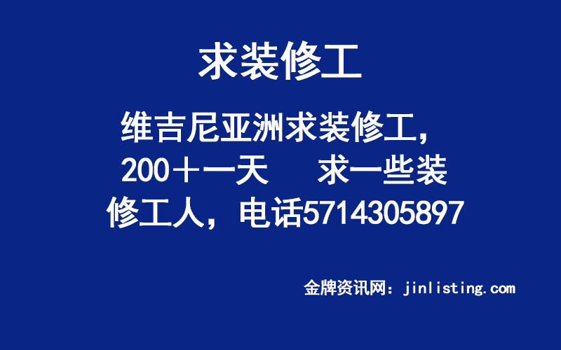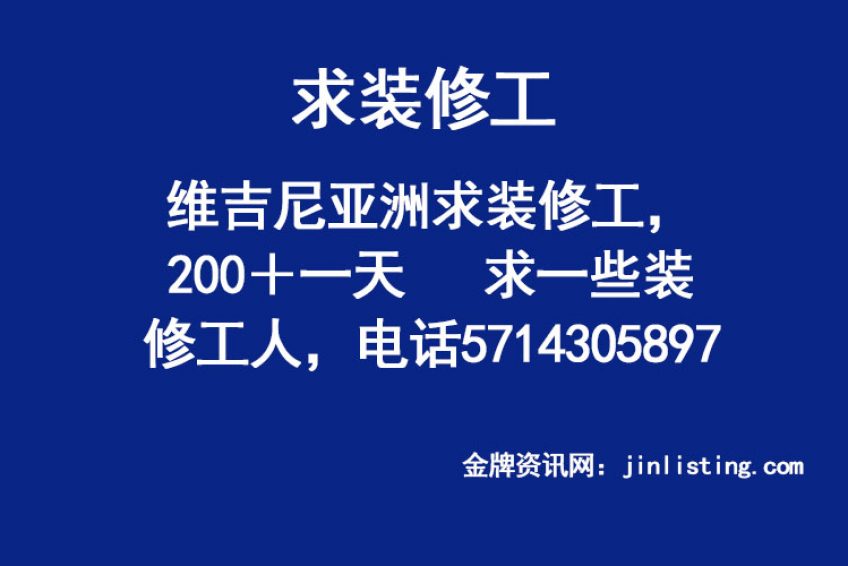 维吉尼亚洲求装修工,200+一天 求一些装修工人,电话5714305897