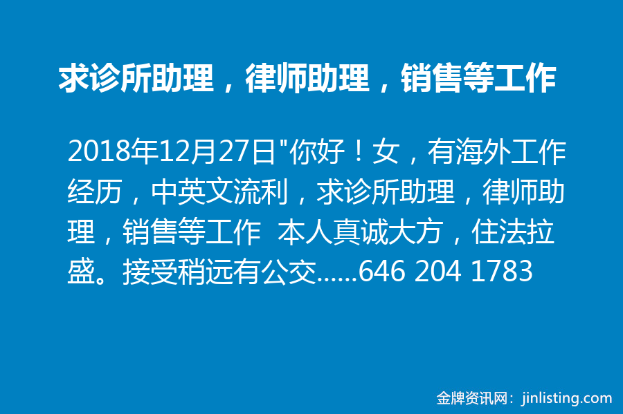 女,有海外工作经历,中英文流利,求诊所助理,律师助理,销售等工作