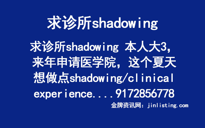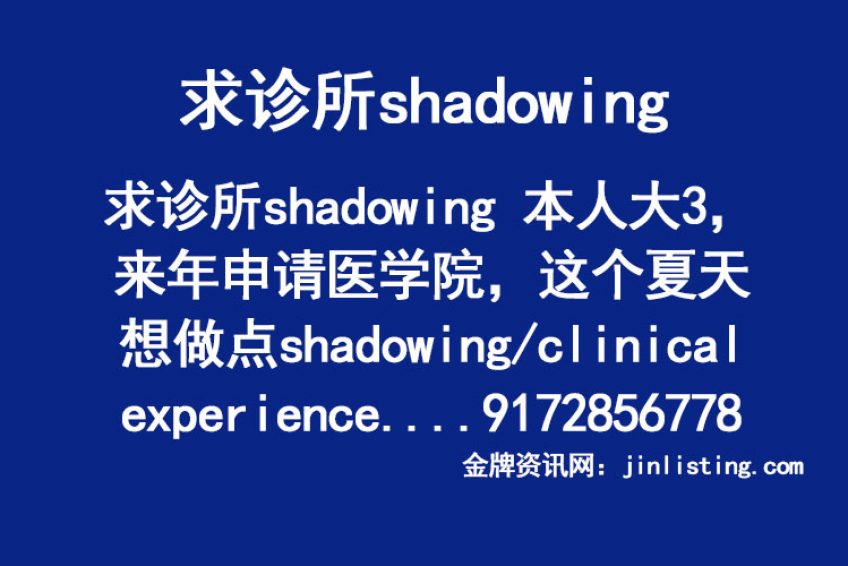 求诊所shadowing 本人大3,来年申请医学院,这个夏天想做点shadowing/clinical experience. 诊所位置最好在法拉盛/皇后区。 之前在牙科诊所里当过前台. 电话9172856778