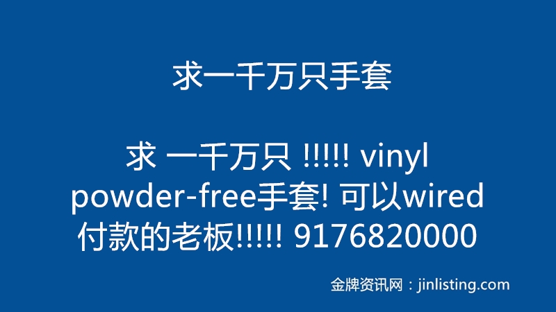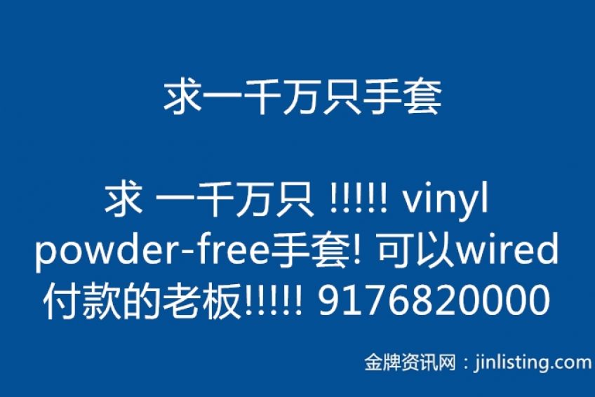 求 一千万只 !!!!! vinyl powder-free手套! 可以wired付款的老板!!!!! 9176820000