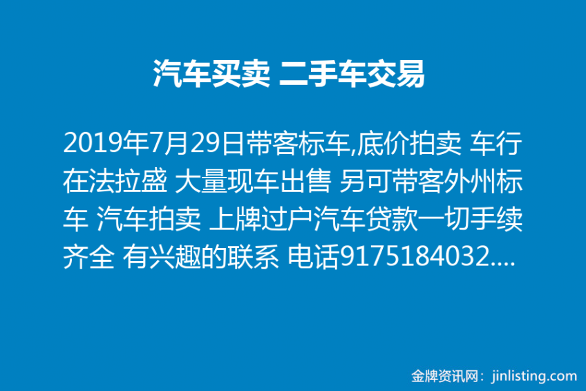 汽车买卖!二手车交易,带客标车,底价拍卖 车行在法拉盛 大量现车出售 另可带客外州标车 汽车拍卖 上牌过户汽车贷款一切手续齐全 有兴趣的联系 电话9175184032 微信541564928 chen