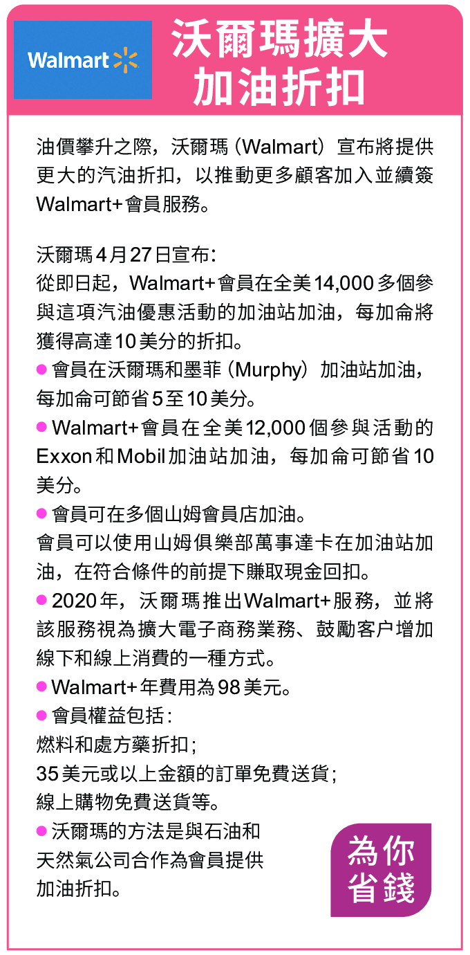 ● 會員在沃爾瑪和墨菲(Murphy)加油站加油,每加侖可節省5至10美分。