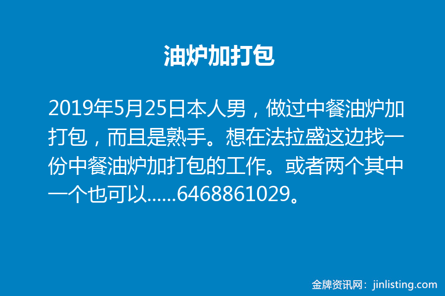 油炉加打包 本人男,做过中餐油炉加打包,而且是熟手。想在法拉盛这边找一份中餐油炉加打包的工作。或者两个其中一个也可以。远一点“包食宿跟接送”都可以。或者7号地铁可以到达,没有转车的最好。有需要的老板请联系我电话:6468861029。