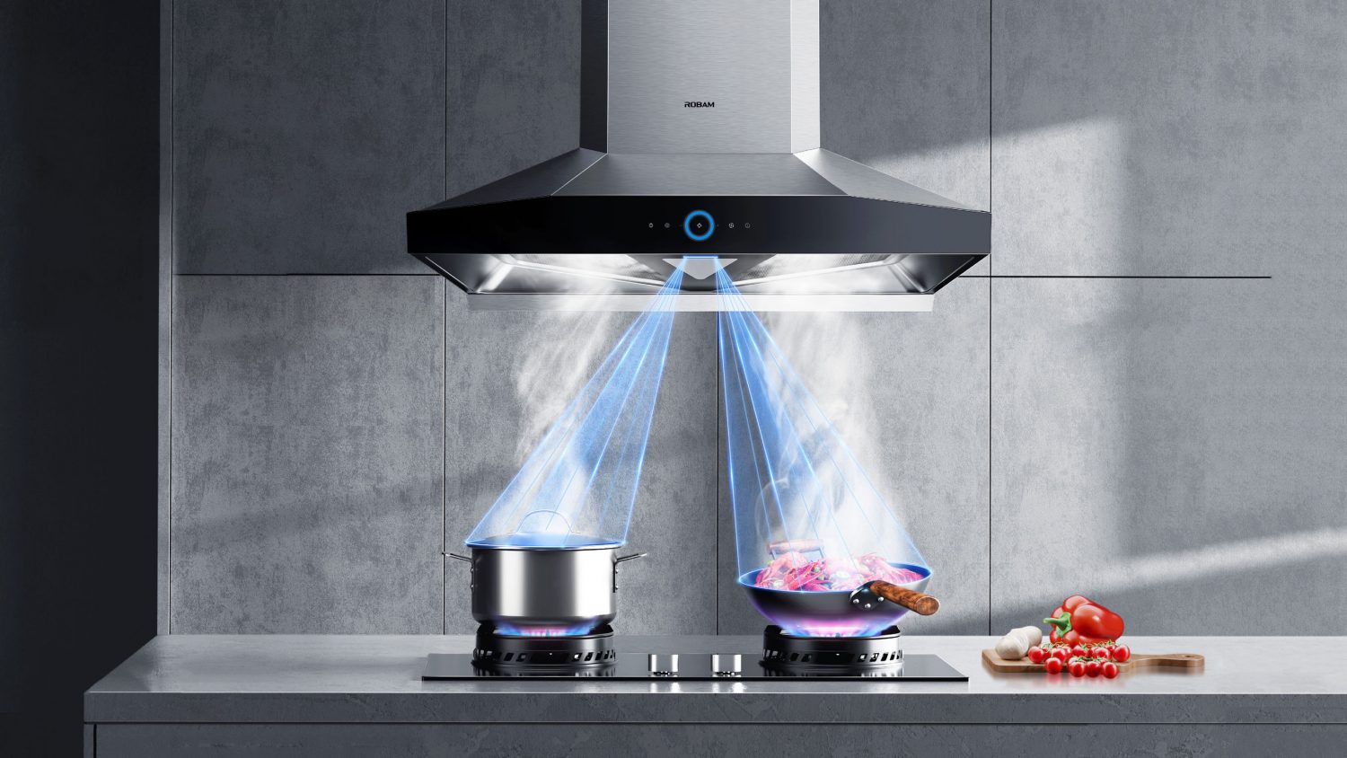 老板电器最新推出的双腔大吸力油烟机,采用最新科技,双腔双吸,实现1秒控烟: