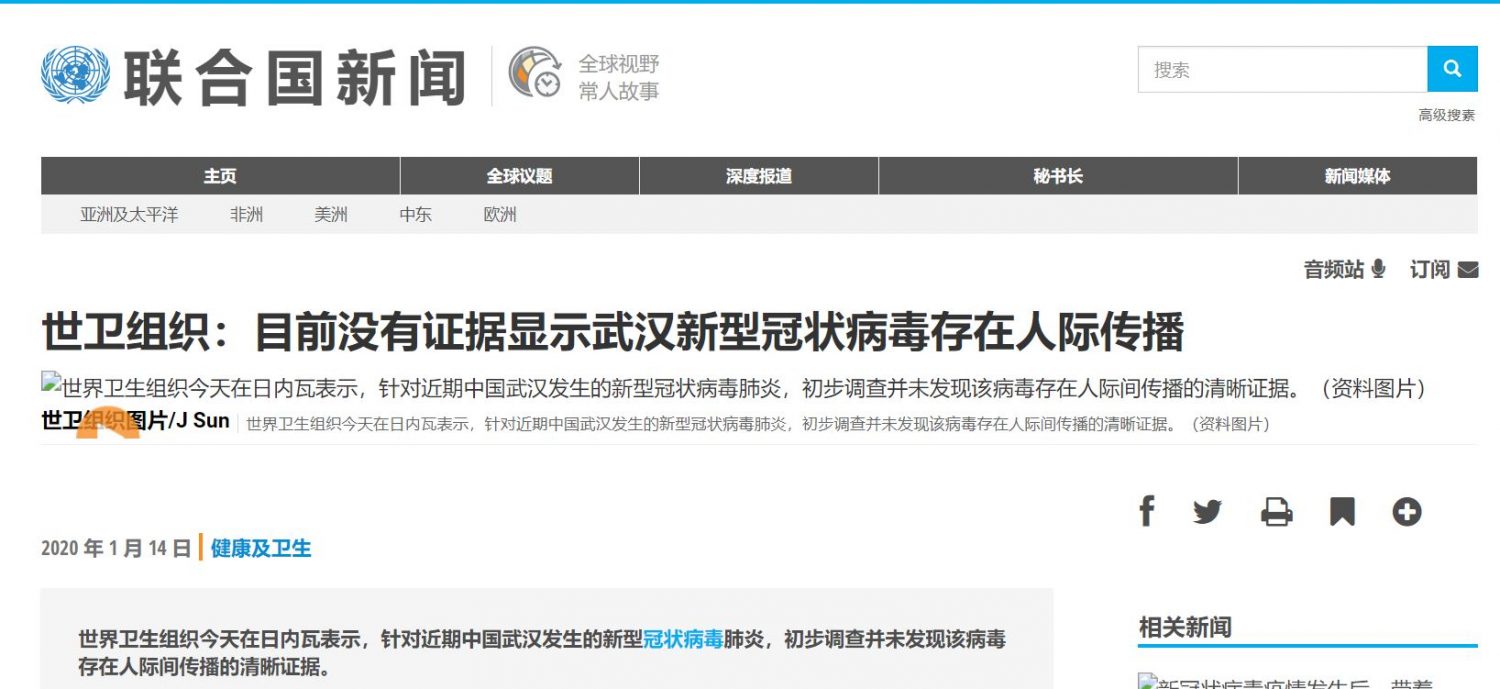 根据联合国官网报导(原文链接),1月14日,世卫组织针对中共肺炎疫情表示,“初步调查没有证据显示武汉新型冠状病毒存在人际传播”。