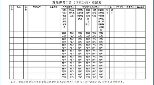 锡林格勒盟卫健委1月15日下发的《发热患者门诊(预检分诊)登记表》大纪元还获得内蒙古锡林格勒盟卫健委1月15日下发的《关于进一步规范医疗机构门诊(预检分诊)发热患者登记工作的通知》。