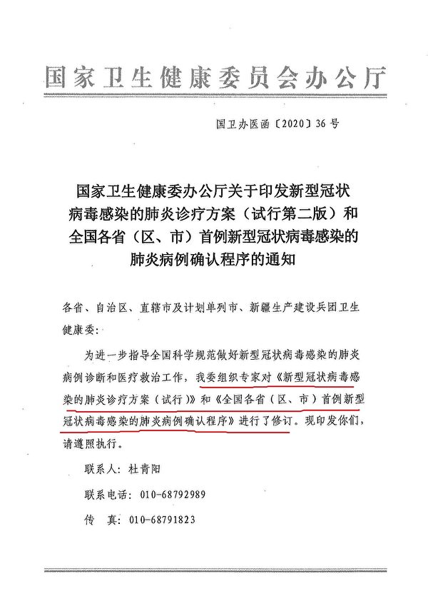 1月18日,中共卫健委修订了“不予公开”的《新型冠状病毒感染的肺炎诊疗方案(试行第二版)》,显示中共对疫情隐瞒多时。 (大纪元)
