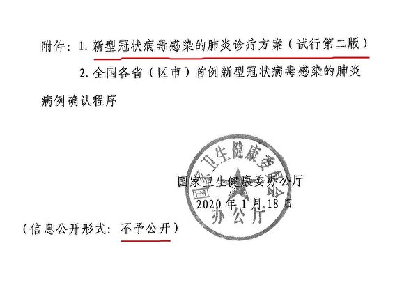 1月18日,中共国家卫健委下发 《关于印发新冠病毒感染的肺炎诊疗方案和全国各省首例新冠病毒感染的肺炎病例确认程序的通知》不过,截至当时(1月18日),中共仍然将中共肺炎的诊疗方案等疫情信息列为“不予公开”。