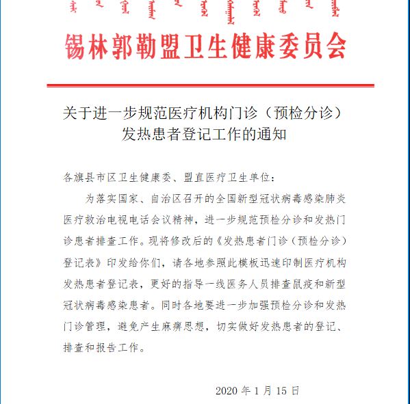 锡林格勒盟卫健委在通知中称,“为落实国家、自治区召开的全国新型冠状病毒感染肺炎医疗救治电视电话会议精神,进一步规范预检分诊和发热门诊患者排查工作”,现将修改后的《发热患者门诊(预检分诊)登记表》印发给各旗县市区卫生健康委。该通知还强调,“各地要进一步加强预检分诊和发热门诊管理,避免产生麻痹思想,切实做好发热患者的登记、排查和报告工作”。
