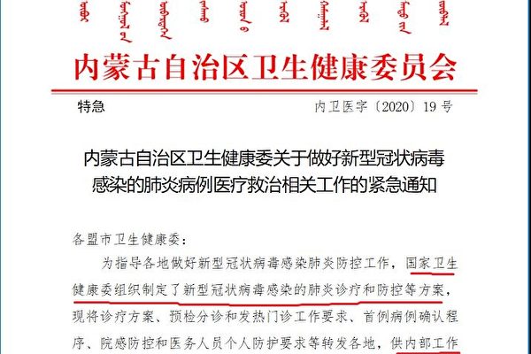 大纪元独家获得内蒙古卫健委1月15日印发的《内蒙古自治区卫生健康委关于做好新型冠状病毒感染的肺炎病例医疗救治相关工作的紧急通知》。该通知不但标明“特急”,而且标注“不予公开”,还强调了“供内部工作使用,不得在互联网传播”。