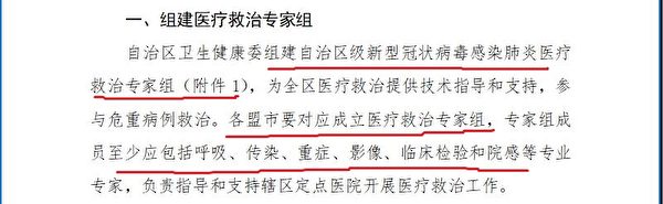 该通知称,“自治区卫生健康委组建自治区级新型冠状病毒感染肺炎医疗救治专家组(附件1),为全区医疗救治提供技术指导和支持,参与危重病例救治。各盟市要对应成立医疗救治专家组,专家组成员至少应包括呼吸、传染、重症、影像、临床检验和院感等专业专家”。