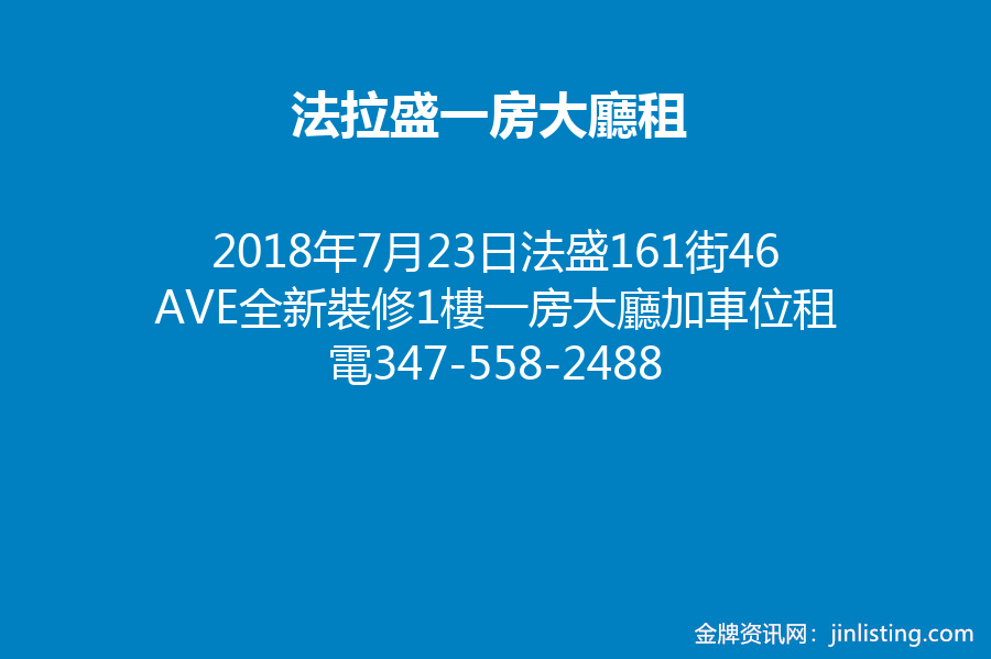 法盛161St 46Ave全新裝修1樓一房大廳加車位租$1850巴士Q 27/26/65電347-558-2488餘太太