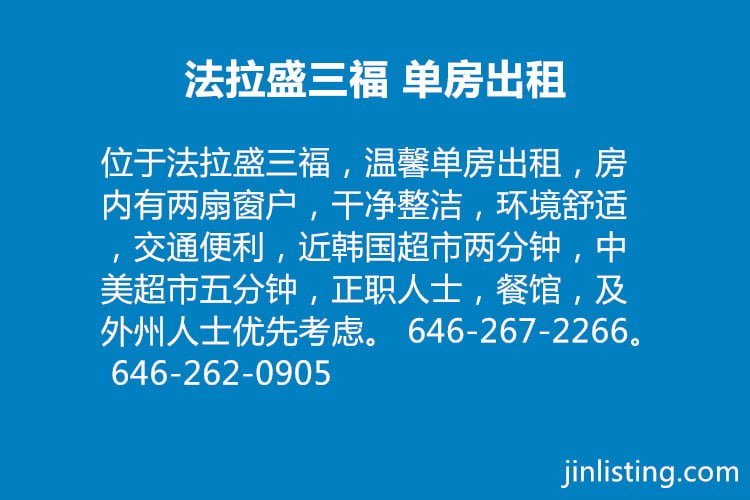 位于法拉盛三福,温馨单房出租,房内有两扇窗户,干净整洁,环境舒适,交通便利,近韩国超市两分钟,中美超市五分钟,正职人士,餐馆,及外州人士优先考虑。 646-267-2266。 646-262-0905
