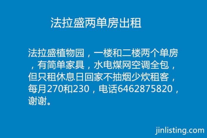 法拉盛植物园,一楼和二楼两个单房,有简单家具,水电煤网空调全包,但只租休息日回家不抽烟少炊租客,每月270和230,电话6462875820,谢谢。