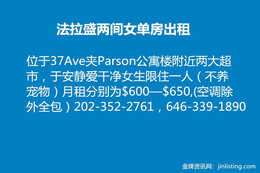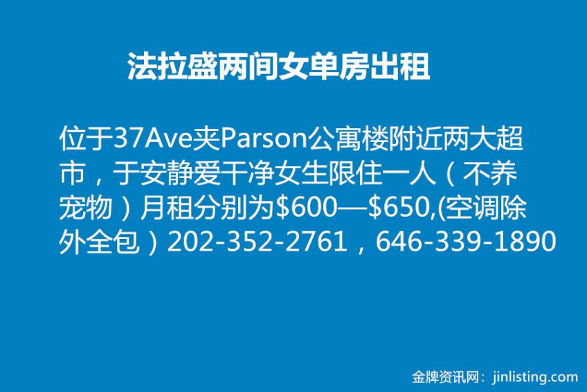 位于37Ave夹Parson公寓楼附近两大超市三分钟步行7号地铁10分钟,适于安静爱干净女生限住一人(不能养宠物)月租分别为$600—$650,(空调除外全包)202-352-2761,646-339-1890如没及时接电话请短信谢谢![微笑]