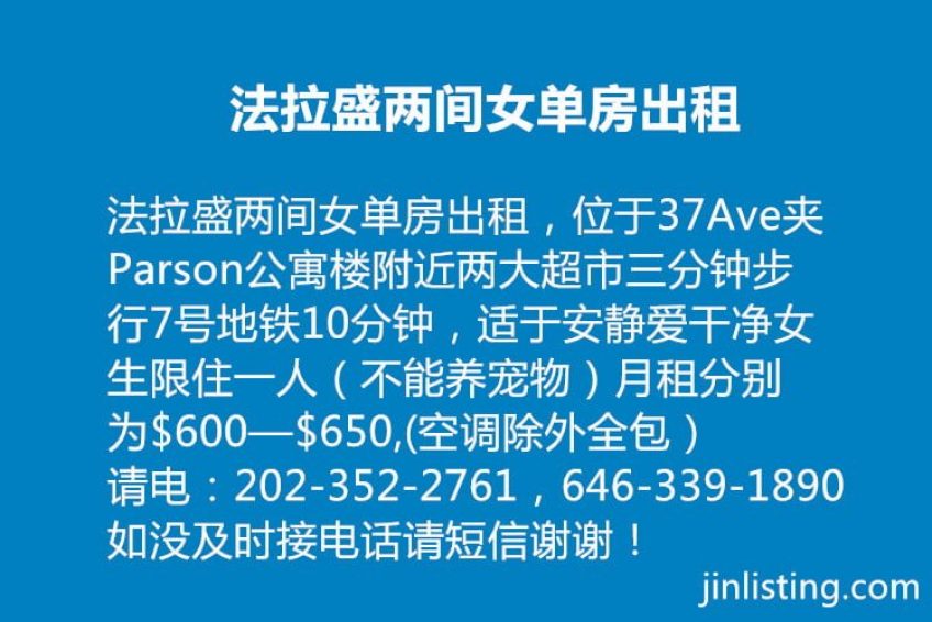 法拉盛两间女单房出租,位于37Ave夹Parson公寓楼附近两大超市三分钟步行7号地铁10分钟,适于安静爱干净女生限住一人(不能养宠物)月租分别为$600—$650,(空调除外全包)请电:202-352-2761,646-339-1890如没及时接电话请短信谢谢![微笑]