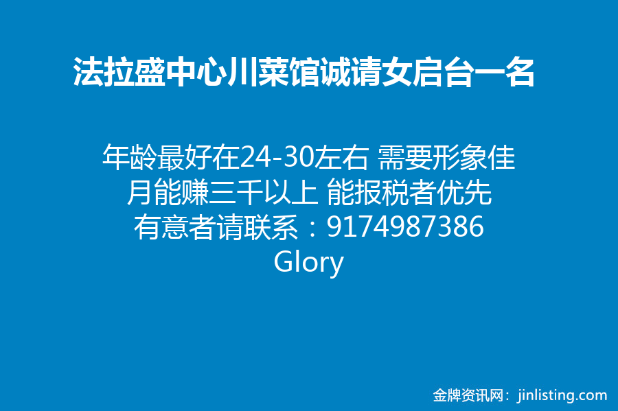 法拉盛中心川菜馆诚请女启台一名 年龄最好在24-30左右 需要形象佳 月能赚三千以上 能报税者优先 有意者请联系:9174987386 Glory