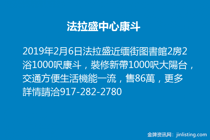 法拉盛中心康斗 法拉盛近缅街图書館2房2浴1000呎康斗,裝修新帶1000呎大陽台,交通方便生活機能一流,售86萬,更多詳情請洽917-282-2780