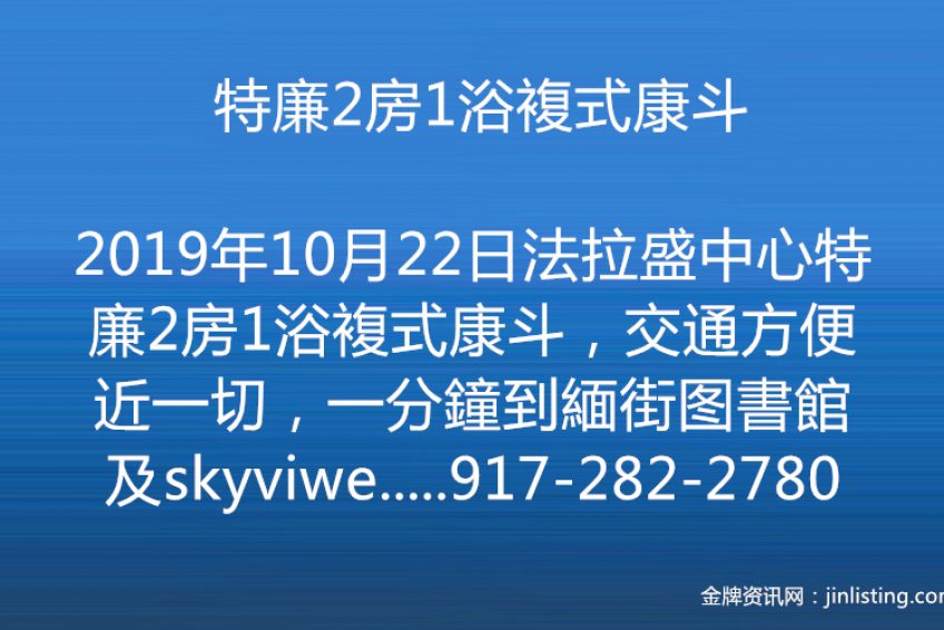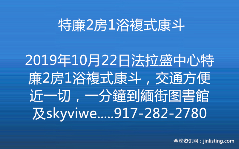 法拉盛中心特廉2房1浴複式康斗,交通方便近一切,一分鐘到緬街图書館及skyviwe mall,低管理費,仍在減税中,投資自住皆宜,僅售49萬餘,合者可以議價,更多房源請洽917-282-2780