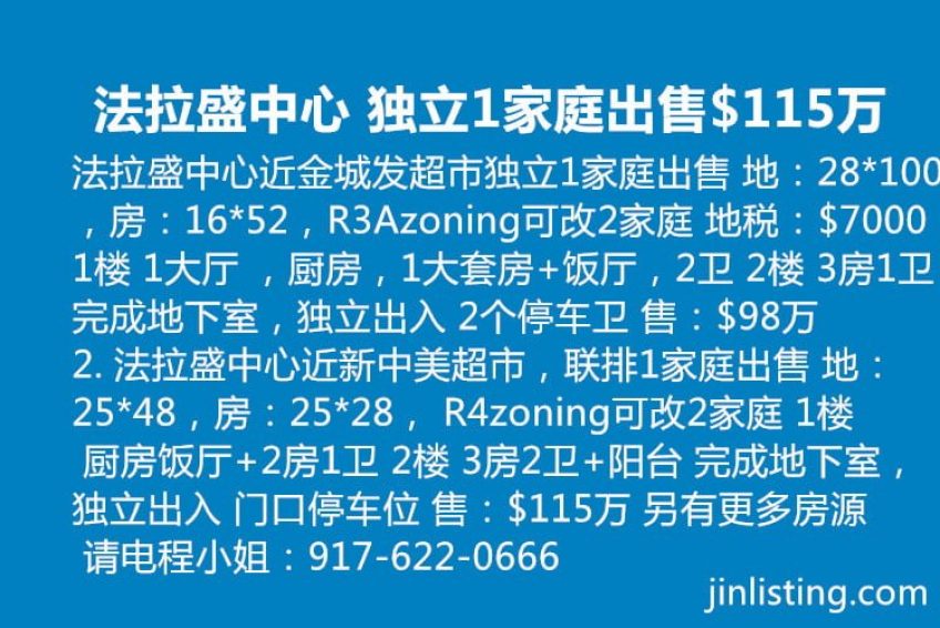法拉盛中心近金城发超市独立1家庭出售 地:28*100,房:16*52,R3Azoning可改2家庭 地税:$7000 1楼 1大厅 ,厨房,1大套房+饭厅,2卫 2楼 3房1卫完成地下室,独立出入 2个停车卫 售:$98万 2. 法拉盛中心近新中美超市,联排1家庭出售 地:25*48,房:25*28, R4zoning可改2家庭 1楼 厨房饭厅+2房1卫 2楼 3房2卫+阳台 完成地下室,独立出入 门口停车位 售:$115万 另有更多房源 请电程小姐:917-622-0666