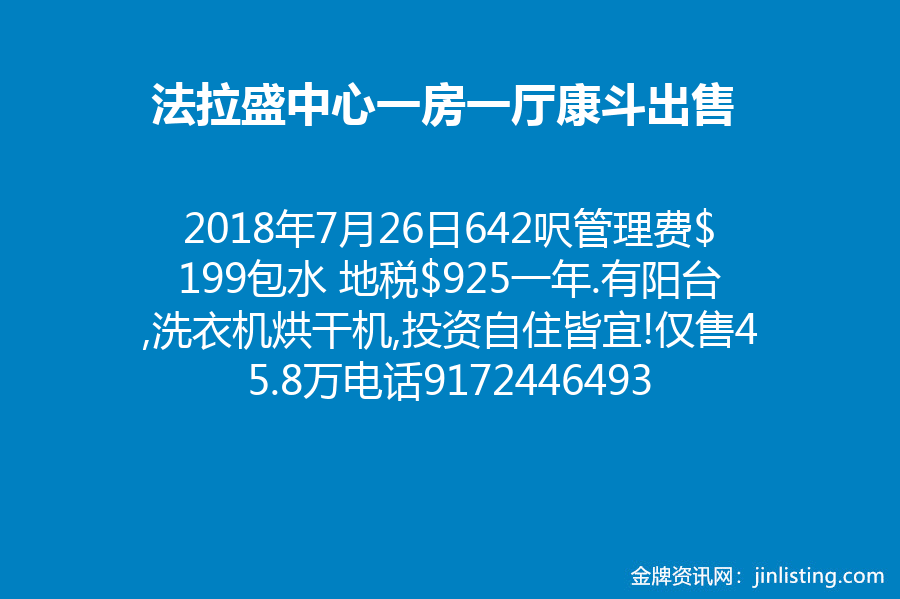 法拉盛中心31-22 Union St #6a 10年新 一房一厅康斗 642呎 管理费$199 包水 地税$925 一年.有阳台,洗衣机烘干机,格局好,精美装修,交通便利,静中带旺,投资自住皆宜! 仅售45.8万 电话9172446493