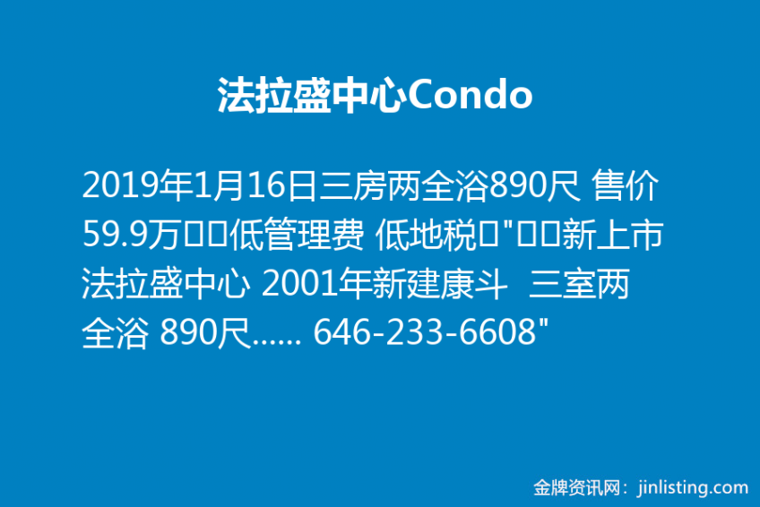 ❤️法拉盛中心Condo❤️三房两全浴890尺 售价59.9万❤️低管理费 低地税 “❤️新上市   法拉盛中心 2001年新建康斗   三室两全浴 890尺   近一切   地税 2425   管理费249   售价 59.9万    经纪人 刘先生 646-233-6608”