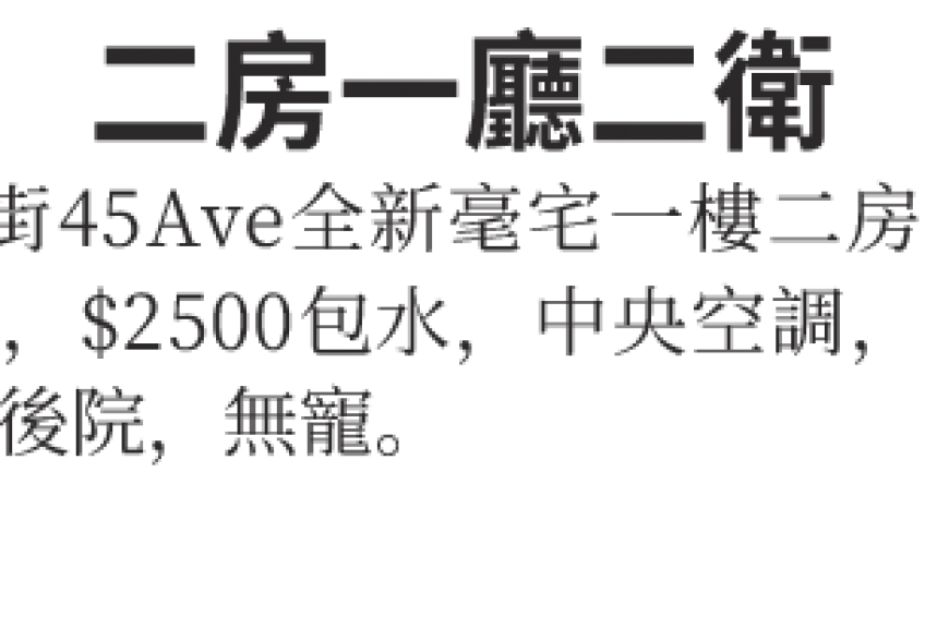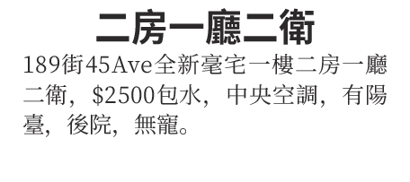 全新毫宅,189st /45 ave 一楼 二房一厅二卫,$2500 包水,