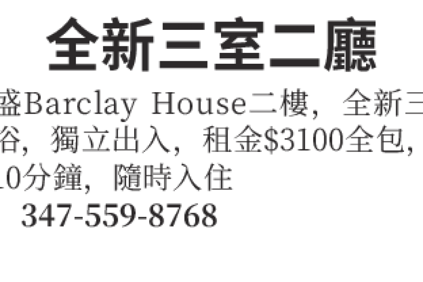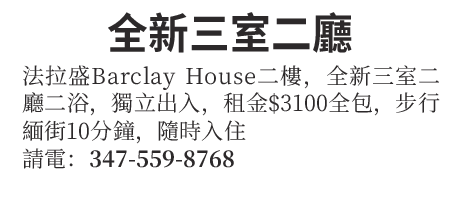 法拉盛Barclay全新三室二厅二浴 House二楼 独立出入