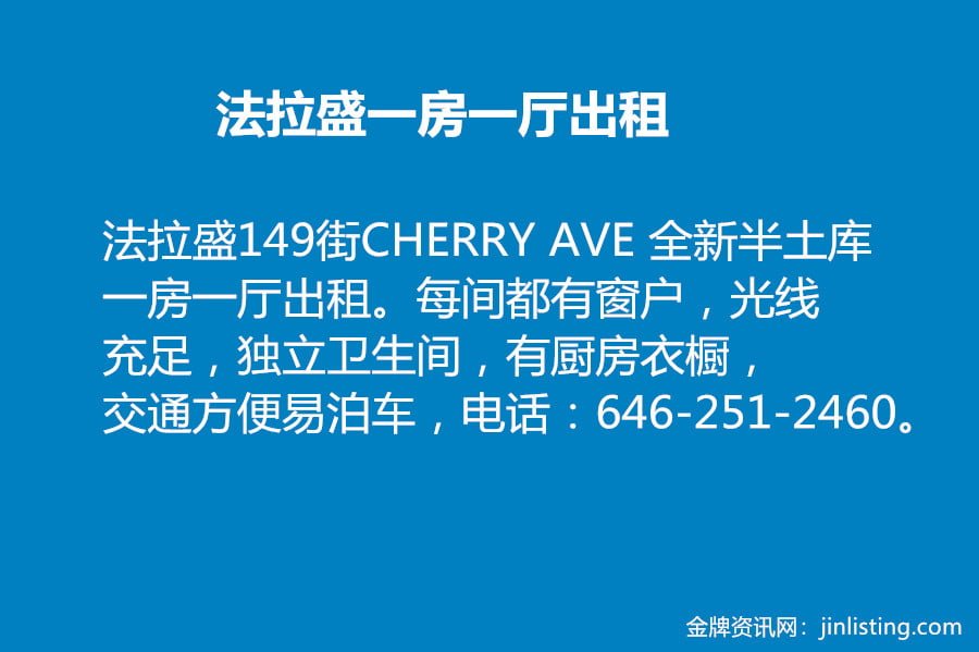 法拉盛149街CHERRY AVE 全新半土库一房一厅出租。每间都有窗户,光线充足,独立卫生间,有厨房衣橱,明亮宽敞环境佳,交通方便易泊车,步行至缅街15分钟。全包。电话:646-251-2460。
