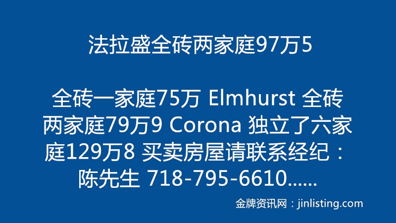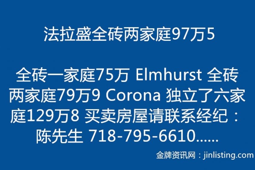 “法拉盛全砖两家庭97万5. 全砖一家庭75万 Elmhurst 全砖两家庭79万9 Corona 独立了六家庭129万8 买卖房屋请联系经纪:陈先生 718-795-6610, keeptohope@gmail.com”