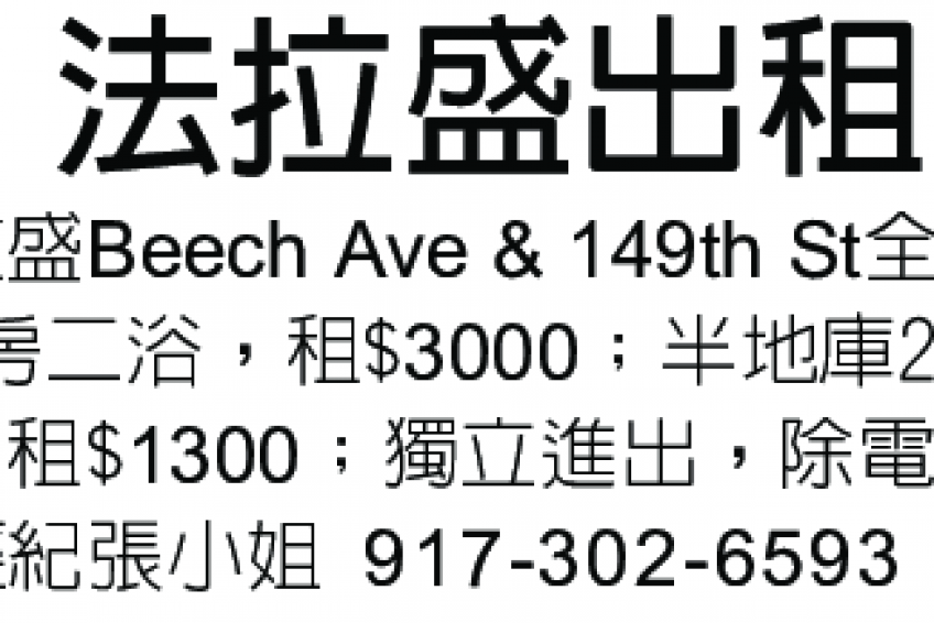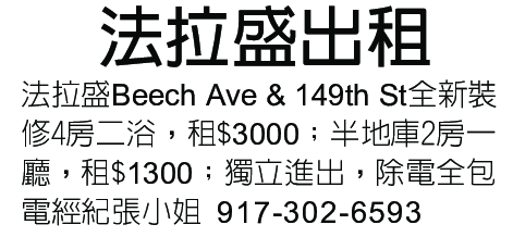 法拉盛Beech Ave & 149th St 全新裝修四房二浴,租3000;半地庫二房一廳,租1300;獨立進出,除電全包,電經紀張:917-302-6593