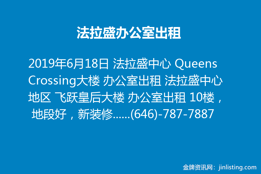 法拉盛中心 Queens Crossing大楼 办公室出租 法拉盛中心地区 飞跃皇后大楼 办公室出租 10楼, 地段好,新装修,环境高档 大楼open 7*24小时 请电询:(646)-787-7887