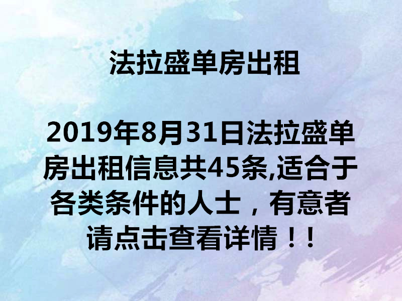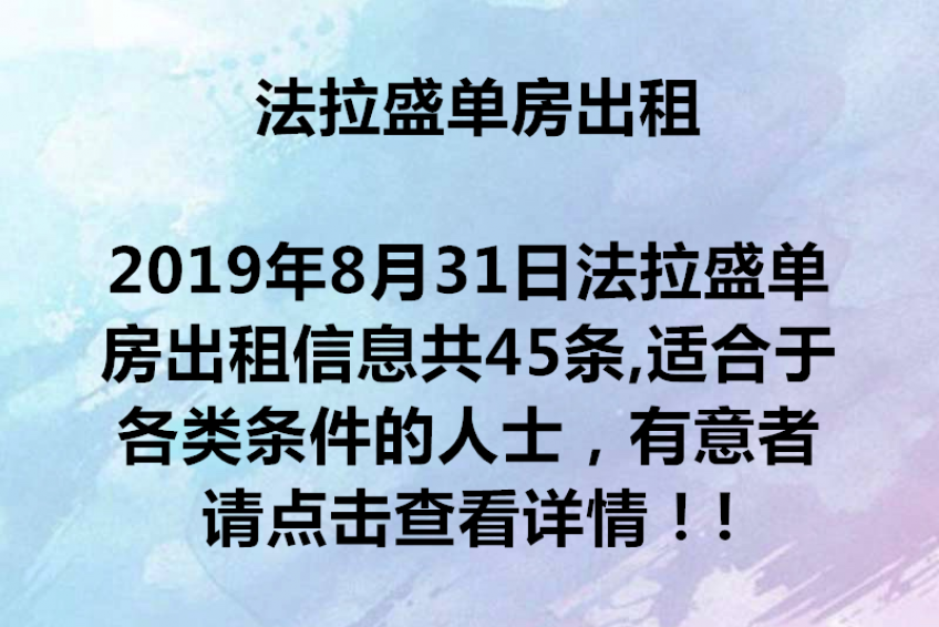 19.法拉盛中心地段单房出租 位置在法拉盛中心地段,超市地铁三分钟可到,楼下各种餐馆小吃店,生活十分便利,现出租一间房子,有床有简单衣柜,房间里有洗衣机烘干机.安静,干净,人少,租一个正职工作爱干净不吵闹的年轻人。有意请打6465754468.如果没接请短信必回,非诚勿扰!