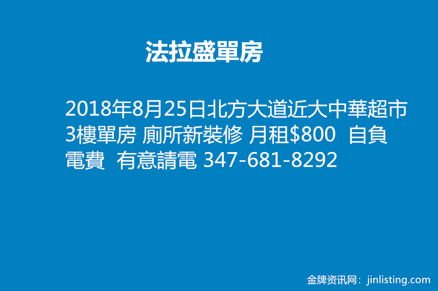 法拉盛北方大道近大中華超市140街,34Ave,3樓單房,廁所新裝修。月租$800,自負電費,有意請電 347-681-8292
