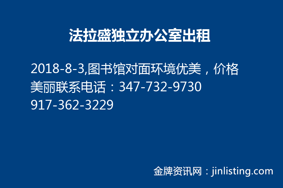 法拉盛图书馆对面有独立办公室出租,联系电话: 347-732-9730