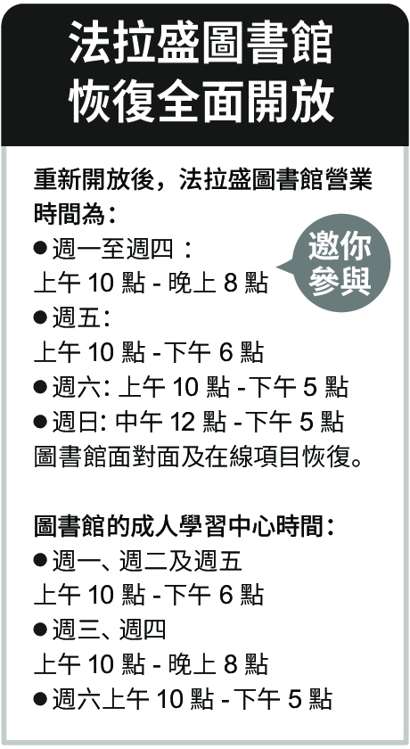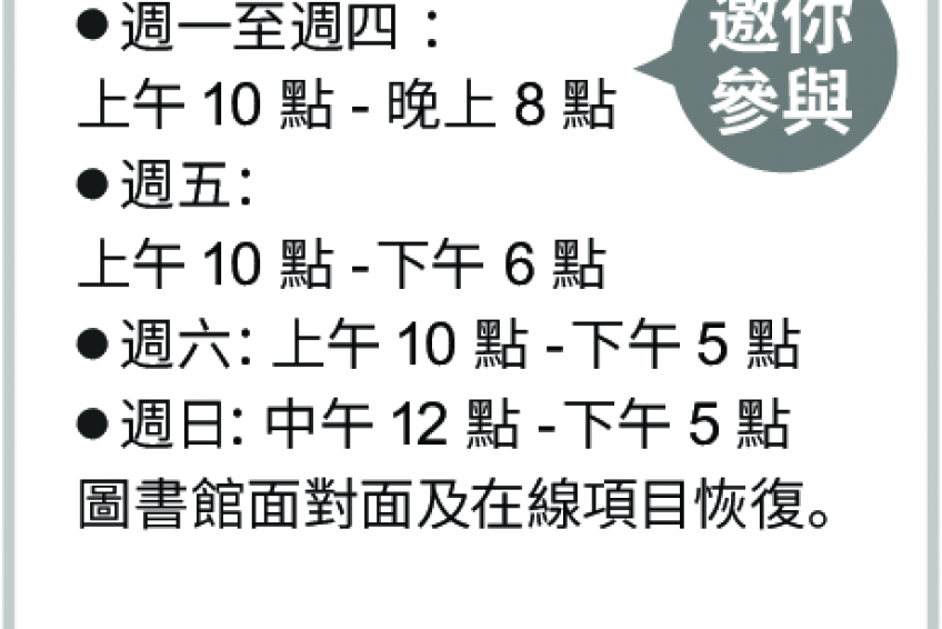 圖書館的成人學習中心時間:● 週一、週二及週五上午10點-下午6點● 週三、週四上午10點-晚上8點● 週六上午10點-下午5點
