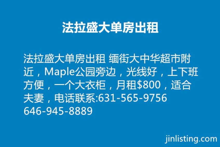 法拉盛大单房出租 缅街大中华超市附近,Maple公园旁边,光线好,上下班方便,一个大衣柜,月租$800,适合夫妻,电话联系:631-565-9756 646-945-8889