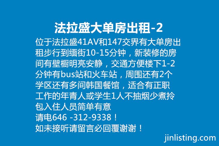 位于法拉盛41AV和147交界有大单房出租步行到缅街10-15分钟,新装修的房间有壁橱明亮安静,交通方便楼下1-2分钟有bus站和火车站,周围还有2个学区还有多间韩国餐馆,适合有正职工作的年青人或学生1人不抽烟少煮拎包入住人员简单有意请电646 -312-9338!如未接听请留言必回覆谢谢!