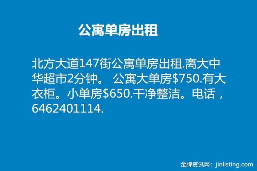 colden st 主卧大单房出租,步行2分钟到中国银行和新昌发超市,3-5分钟邮局,地铁,梅西,新世纪美食城,房间有简单家具(床,床垫,电视柜,大衣橱柜)高速上网,此房是一室一厅,主卧出租,人员简单,环境安静,适合不吸烟,爱干净,单身人士可拎包入住,有兴趣可以联系电话6462363315