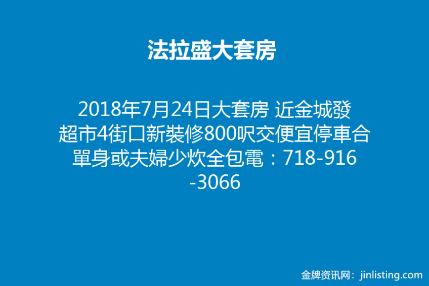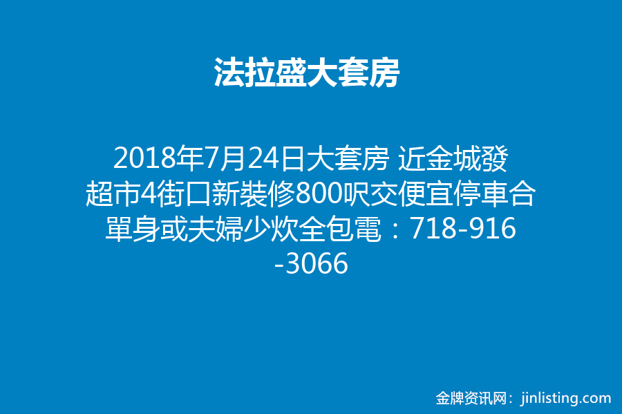 大套房 近金城發超市4街口新裝修800呎交便宜停車合單身或夫婦少炊全包電:718-916-3066