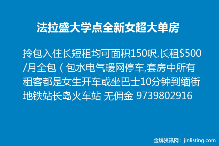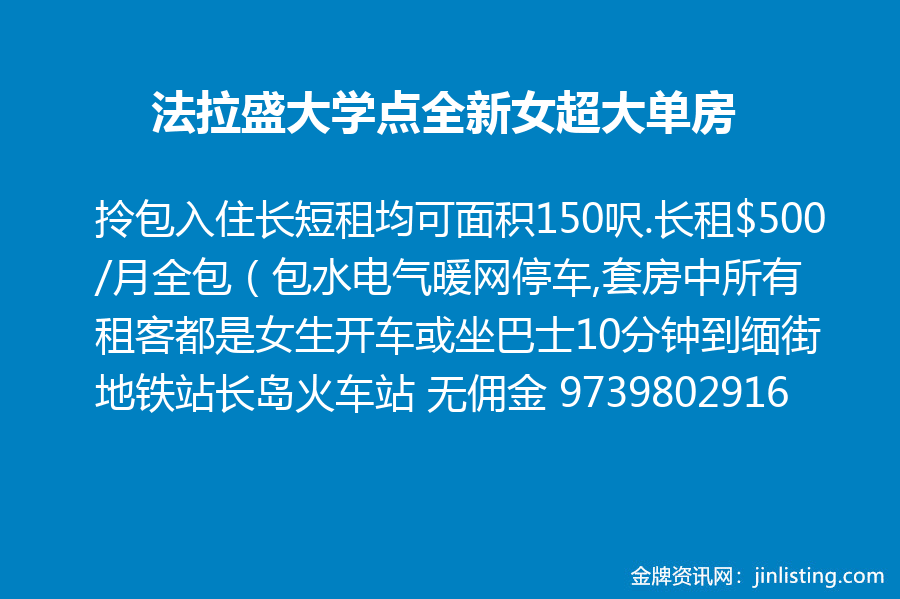拎包入住长短租均可。法拉盛大学点全新1300尺四房一厅中女超大单房出租。面积150呎.长租$500/月全包(包水电气暖网停车) 套房中所有租客都是女生。安全整洁。房间大安静独立出入可炊环境优易泊车近巴士高速公路.步行两分钟到洗衣店小卖部。步行十分钟到超市餐馆。步行三分钟到海边公园可以远眺曼哈顿美景。开车或坐巴士10分钟到缅街地铁站长岛火车站。所有都价格可商量。无佣金。电话 9739802916。