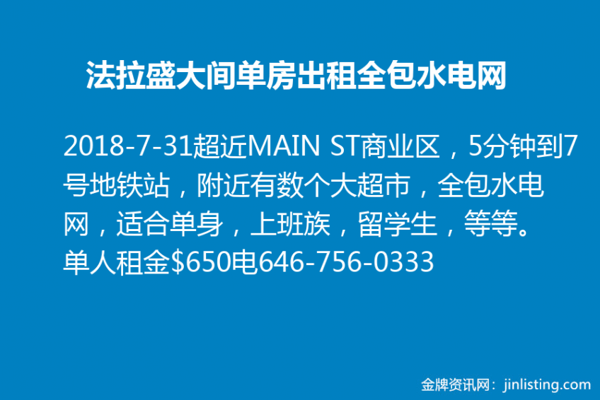 位于法拉盛SANDFORD AVE,超近MAIN ST商业区,5分钟到7号地铁站,附近有数个大超市,全包水电网,适合单身,上班族,留学生,等等。价钱面谈,单人租金$650,提供床架与衣柜。有意者电:646-756-0333 。短信:646-756-0666