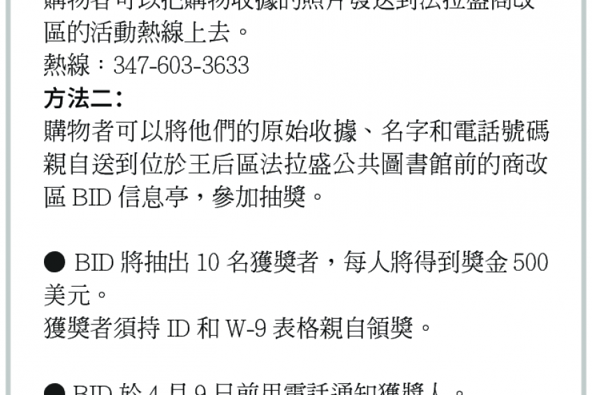 購物者可以將他們的原始收據、名字和電話號碼親自送到位於王后區法拉盛公共圖書館前的商改區BID信息亭,參加抽獎。
