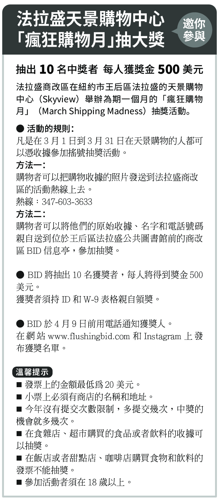 法拉盛商改區在紐約市王后區法拉盛的天景購物中心(Skyview)舉辦為期一個月的「瘋狂購物月」(March Shipping Madness)抽獎活動。